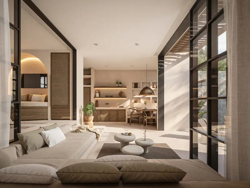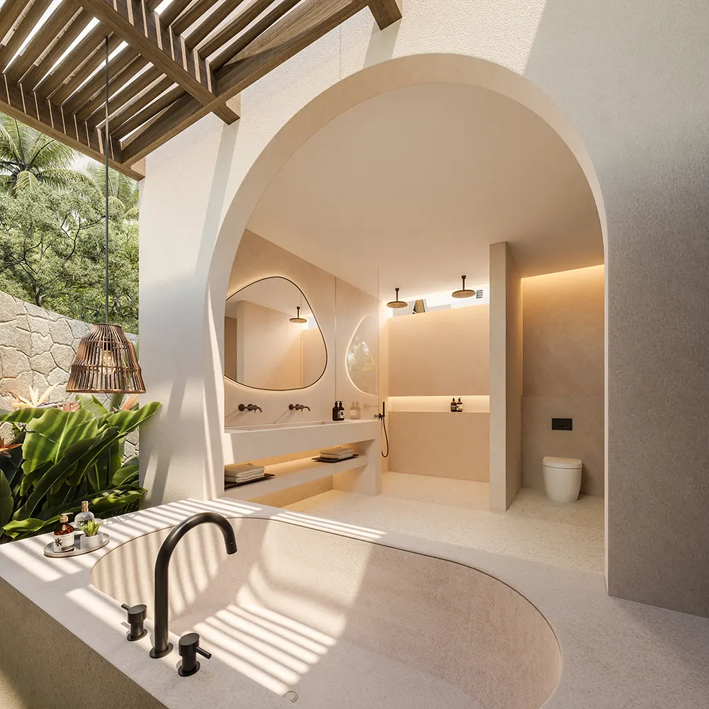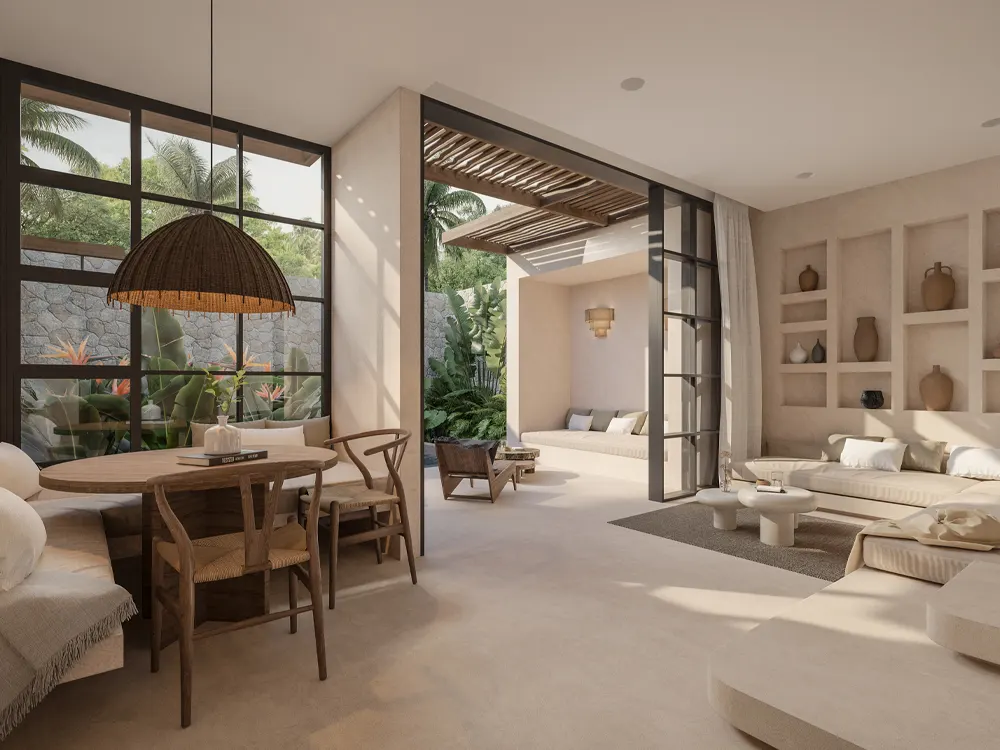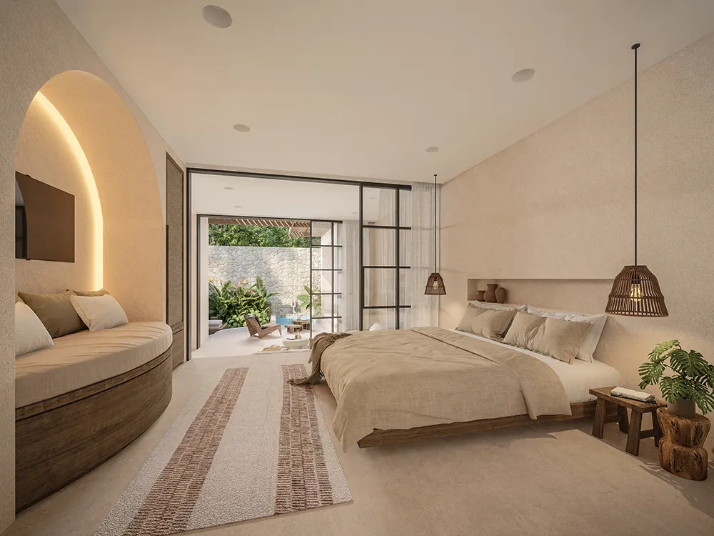 Nestled within a lush tropical oasis: our new 1-Bedroom Villas, each featuring a private garden, pool, and outdoor living area